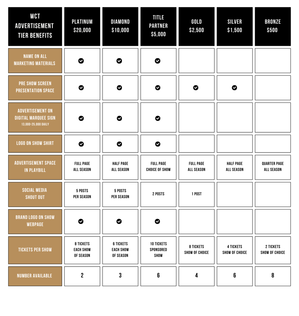 Waco Civic Theatre reaches 30,000+ audience members each season, with over 1,000 patrons attending performances each weekend and 57,000+ social media views extending visibility beyond the theatre. Sponsorship levels build on this reach, with Platinum and Diamond sponsors receiving year-long, top-tier exposure across all shows and platforms; Individual Show sponsors gaining high-impact branding tied to a single production; and Gold, Silver, and Bronze sponsors enjoying meaningful entry-level visibility while supporting the arts in our community.